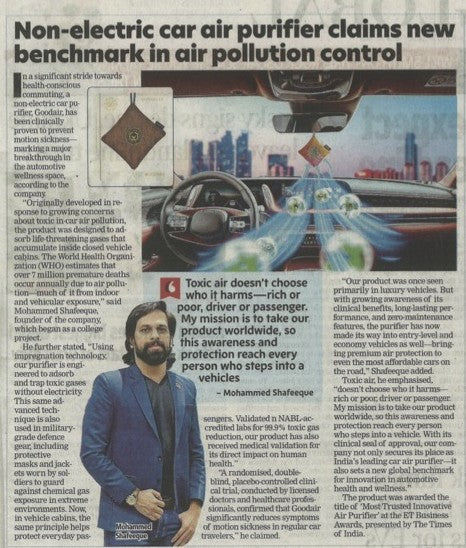 - GOODAIR’s effectiveness in adsorbing toxic gases and enhancing in-car well-being is backed by scientific validation. It has been independently tested and certified by a NABL-accredited laboratory, confirming its ability to adsorb harmful toxic gases commonly present inside cars. Additionally, GOODAIR is clinically proven to reduce symptoms of motion sickness, making it a healthy and trusted choice for safe and comfortable travel.